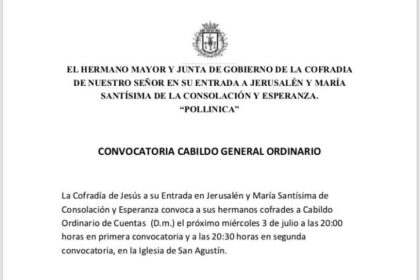 La Cofradía de la Pollinica de Antequera convoca Cabildo de Cuentas este miércoles