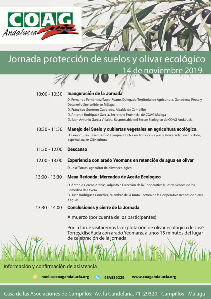La Casa de las Asociaciones de Campillos acogerá este jueves 14 de noviembre una jornada sobre protección de suelos y olivar ecológico. Esta jornada ha sido organizada por la Unión de Agricultores y Ganaderos de Andalucía y será inaugurada a las diez de la mañana por el delegado provincial de la Consejería de Agricultura, Ganadería, Pesca y Desarrollo Sostenible, Fernando Fernández; el alcalde de Campillos, Francisco Guerrero; el secretario provincial de COAG Málaga, Antonio Rodríguez; y el responsable del sector ecológico de COAG Andalucía, Juan Antonio García.