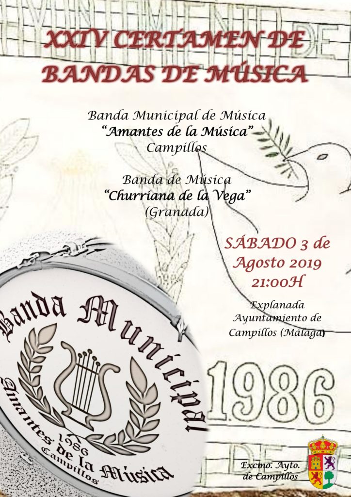 El próximo sábado, 3 de agosto, a las nueve de la noche, tendrá lugar en la explanada del Ayuntamiento de Campillos, su vigésimo cuarto certamen de bandas de música de la localidad.