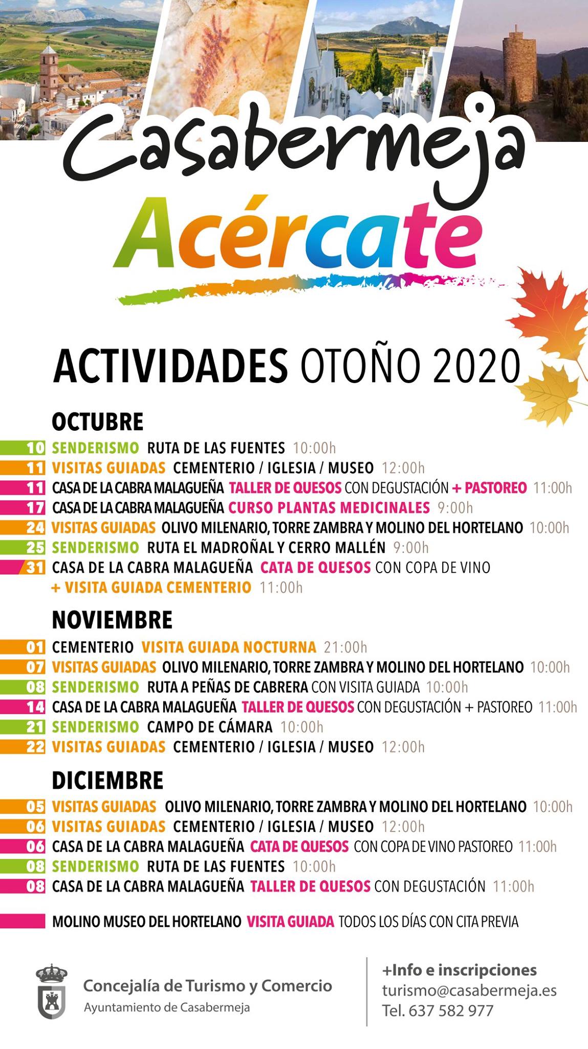 A partir del diez de octubre, el calendario de actividades dará comienzo con rutas de senderismo por enclaves naturales de la localidad, así como también se llevarán a cabo visitas guiadas por lugares emblemáticos de Casabermeja, tales como el cementerio, la iglesia, el museo o al olivo milenario y la torre Zambra.