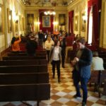 Carmona, Juanillo Tania, Joaquín García, Juanjo Fernández, Joselito y Juan Pablo vieron cartulina durante el encuentro.