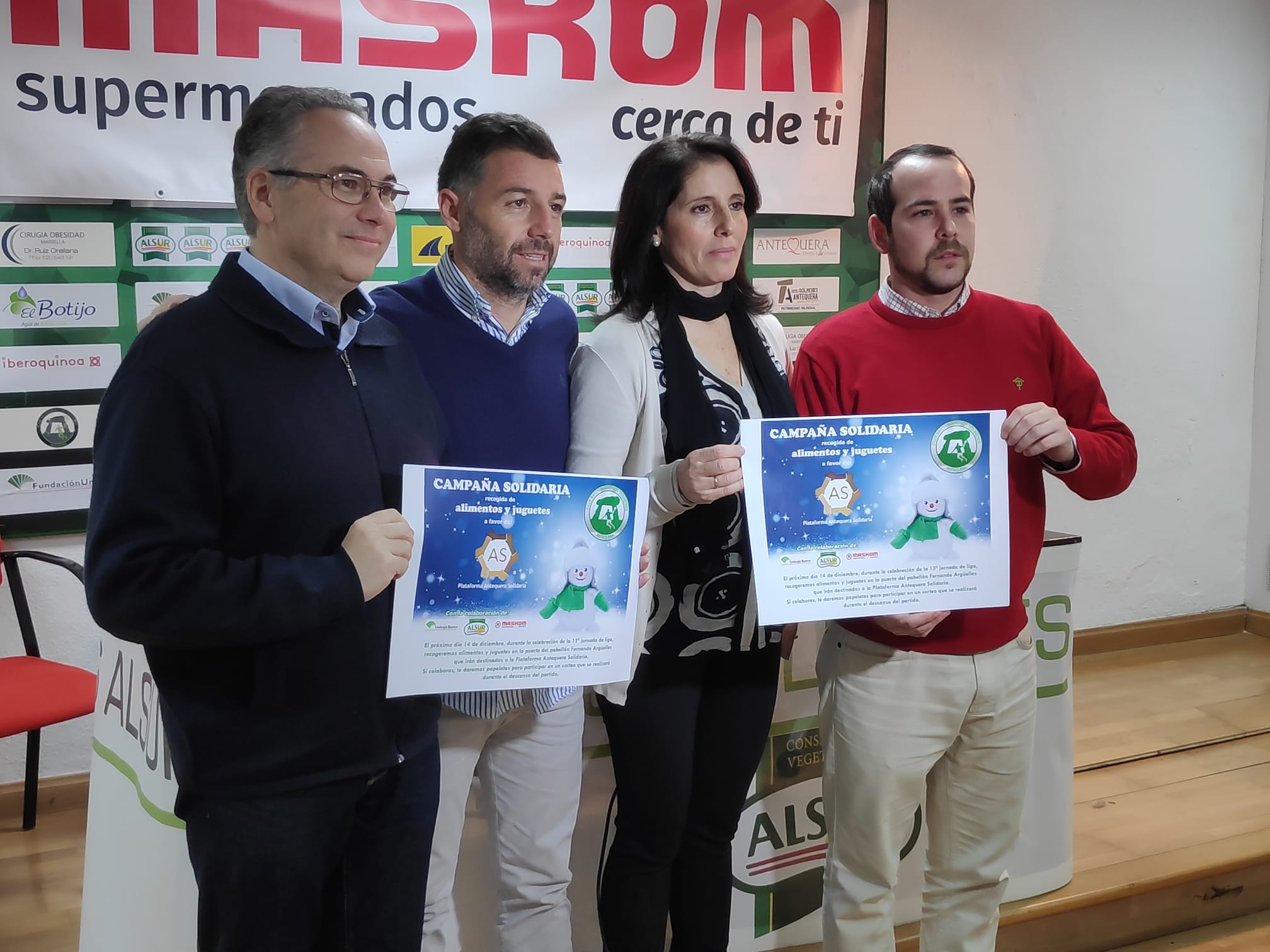 La presidenta del Conservas Alsur Balonmano Los Dólmenes, Lourdes Melero, junto con los representantes de la Plataforma Antequera Solidaria y la empresa Maskom y el concejal de deportes, presentaron la nueva iniciativa solidaria que ha puesto en marcha el club. Colaboran también en la campaña Unicaja Banco y Alsur Conservas y Vegetales.