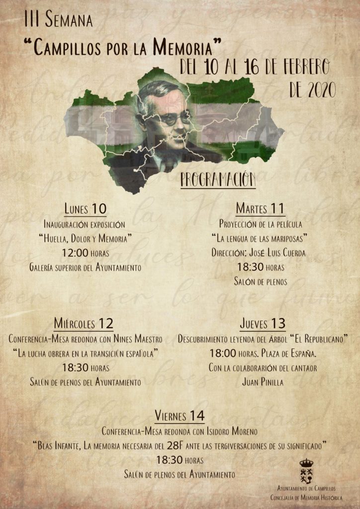 Durante la Semana ‘Campillos por la Memoria’ se desarrollarán las siguientes actividades; el lunes, 10 de febrero, tendrá lugar la inauguración, a las doce de la mañana, de la exposición fotográfica ‘Huella, dolor y memoria’, que se exhibirá en el salón de exposiciones del Ayuntamiento durante toda la semana. El martes, 11 de febrero, la proyección de la película ‘La lengua de las mariposas’, dirigida por José Luis Cuerda. La proyección tendrá lugar a las seis y media de la tarde en el salón de Plenos del Ayuntamiento. El miércoles, 12 de febrero, la conferencia con Nines Maestro titulada ‘La lucha obrera en la transición española’, a partir de las seis y media de la tarde en el salón de plenos del Ayuntamiento. El jueves, 13 de febrero, el descubrimiento de leyenda ‘El republicano’ en un árbol de la localidad. Este acto tendrá lugar a las seis de la tarde en la Plaza de España y contará con la colaboración del cantaor Juan Pinilla. Por último, el viernes, 14 de febrero, la mesa redonda con Isidoro Moreno denominada ‘Blas Infante, la memoria necesaria del 28F ante las tergiversaciones de su significado’, a partir de las seis de la tarde en el salón de plenos del Ayuntamiento.