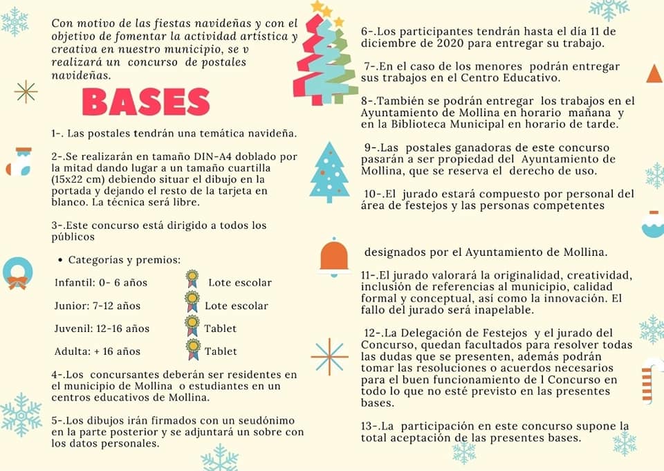 Los concursantes deberán de ser residentes de Mollina o estudiantes en centros educativos de la localidad, teniendo que entregar su trabajo antes del 11 de diciembre en sus Centros Educativos, o por la mañana en el Ayuntamiento de Mollina y tardes en la Biblioteca Municipal.