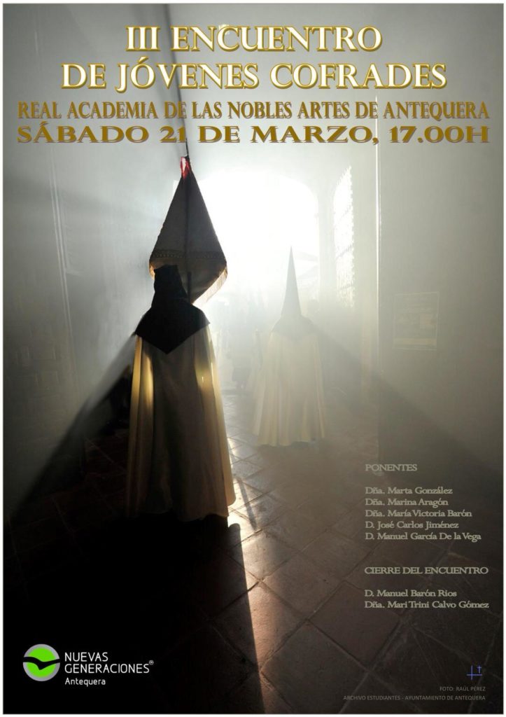 El Presidente de Nuevas Generaciones del Partido Popular de Antequera, José Manuel Fernández, ha anunciado junto con miembros de su Comité Ejecutivo, la organización de una nueva edición, la tercera para ser exactos, del «Encuentro de Jóvenes Cofrades», que se celebrará el próximo sábado 21 de marzo a partir de las cinco de la tarde en la sala de conferencias de la Real Academia de las Nobles Artes de Antequera.